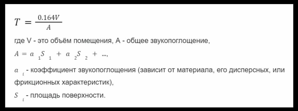 Основной характеристикой этого явления является время реверберации, которое рассчитывается по формуле Уолесса Сэбина: