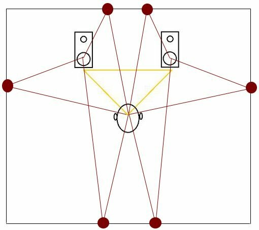 Сядьте в точке прослушивания и попросите своего друга перемещать зеркало вокруг своей головы и вдоль стены, пока слева вы не увидите правую колонку, а справа - левую. Эти точки и будут точками отражения от стен. Тоже самое можно проделать с потолком, аккуратно воспользовавшись стулом или стремянкой.