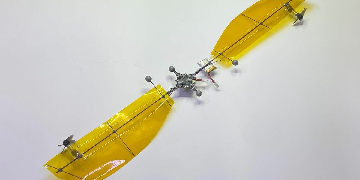Малюсенькие электродвигатели раскручивают не само крыло, а миниатюрные пропеллеры вблизи кончиков крыла - дальше работают чудеса аэродинамики. Картинка завораживает, но интересно дождаться практических применений: уж больно фантастическим выглядит соотношение массы и времени полета по меркам привычных квадрокоптеров - да и сам вес тоже:)