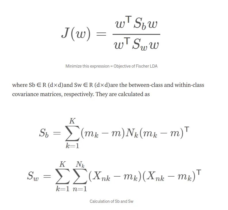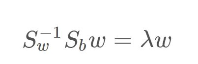 которая является проблемой собственных значений для матрицы inv(Sw).Sb . Таким образом, нашим окончательным решением для w будут собственные векторы приведенного выше уравнения, соответствующие наибольшим собственным значениям. Для приведения к d' измерениям мы берем d' самых больших собственных значений, так как они будут содержать больше всего информации. Также обратите внимание, что если у нас есть K классов, максимальное значение d′ может быть K−1