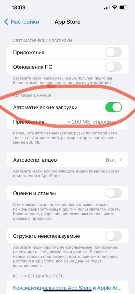 Чтобы отключить автоматические обновления при использовании сотовых данных, отключите переключатель «Автоматические загрузки» в подразделе «Сотовые данные».