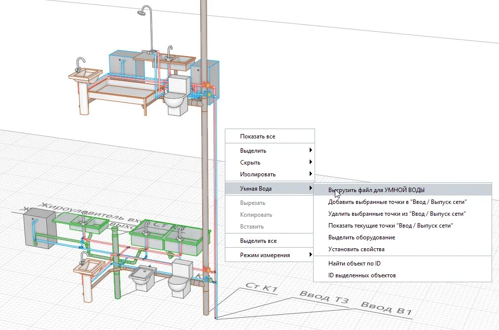 Вы можете выполнять расчет на основе модели инженерных сетей построенных в программе Умная вода, а можете передать в расчётную программу информацию о сетях из модели Renga.