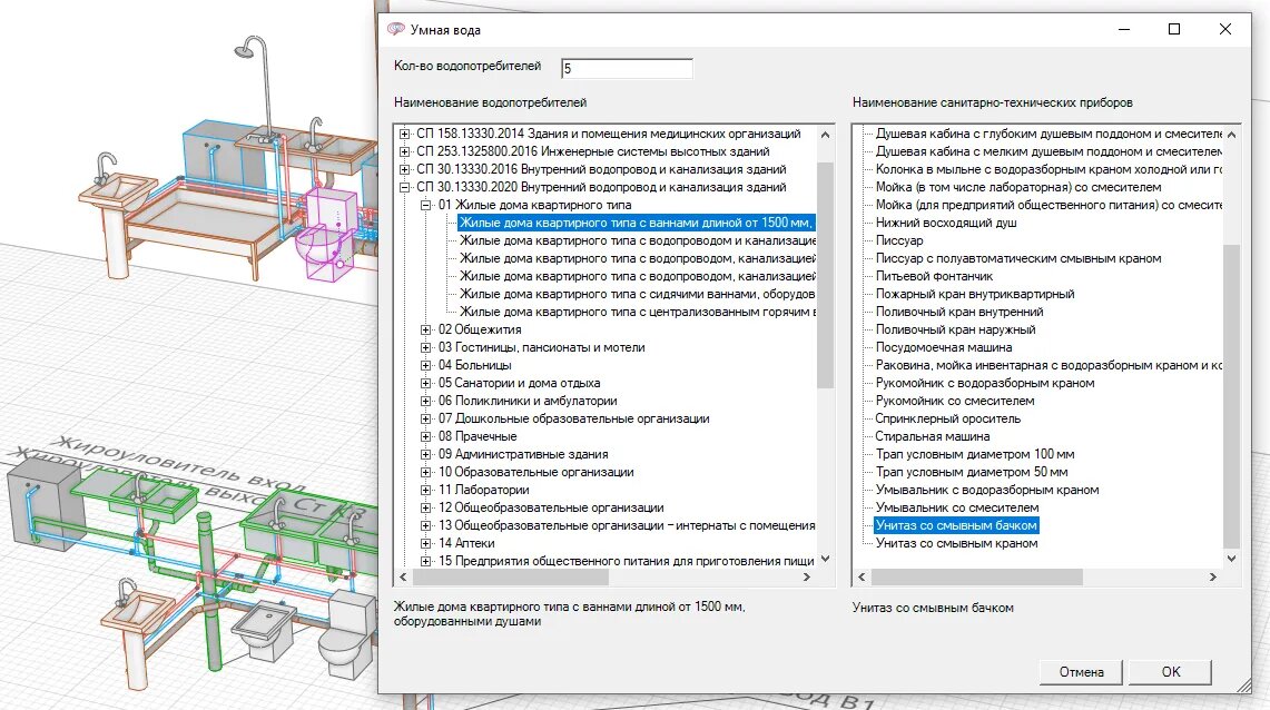 Выбираем из списка наименование водопотребителей и приборов в соответствии с СП