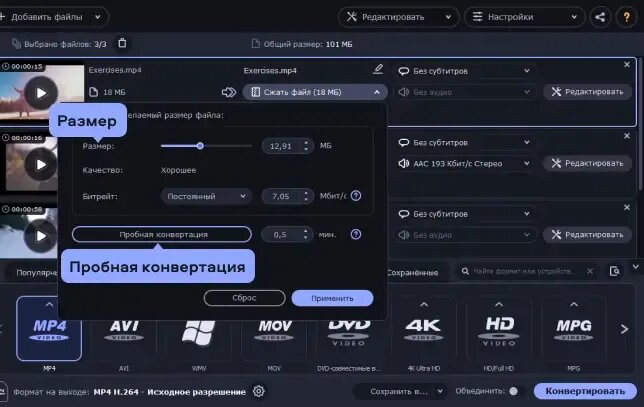Вернитесь в главное окно конвертера и кликните по строке с размером выходного файла. В открывшемся окне с помощью ползунка Размер установите необходимый уровень качества и битрейт. Вы можете нажать кнопку Пробная конвертация, чтобы оценить по небольшому отрывку, как будет выглядеть файл после конвертации. Мы рекомендуем использовать этот способ в том случае, если вам нужно небольшое уменьшение, например, до 10% от исходного размера. При сжатии до минимального размера вы рискуете получить крайне размытое видео.