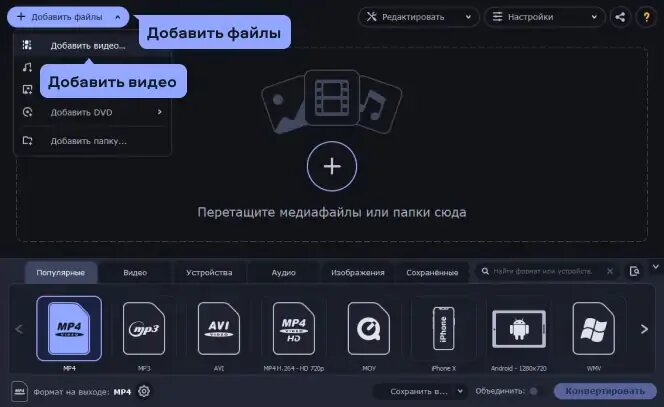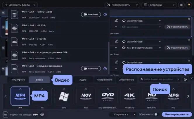 Выберите требуемый формат или мобильное устройство из ленты профилей внизу. Вы также можете воспользоваться поиском профилей, чтобы быстро найти нужный формат или устройство. Кроме того, вы можете подсоединить свое устройство к компьютеру и нажать кнопку со значком мобильного телефона справа от строки поиска – и программа автоматически определит ваше устройство и предложит подходящий пресет.