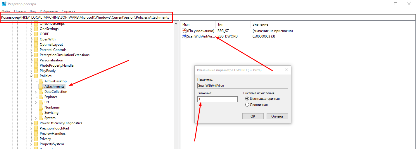 Далее откройте редактор реестра (WIN + R) напишите команду "regedit" и нажмите ввод. Откроется редактор реестра, вам необходимо пройти по следующему пути: HKEY_LOCAL_MACHINE\Software\Microsoft\Windows\CurrentVersion\Policies\Attachments