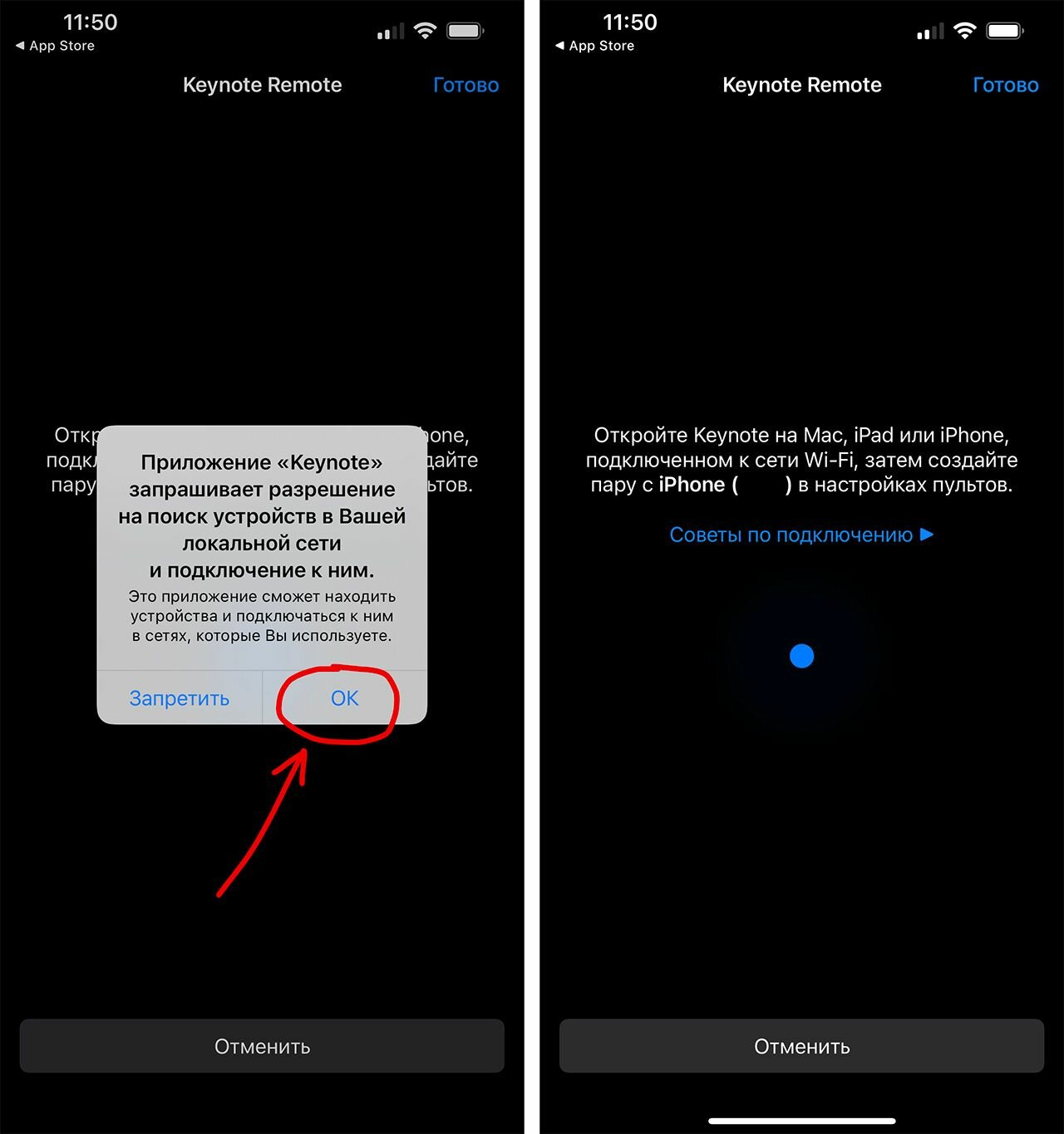 Эта настройка делается один раз. Впоследствии вы просто запускаете Keynote на Mac и iPhone, нажимаете на iPhone кнопку управления презентации (пункт 1) и всё подключается автоматически.
