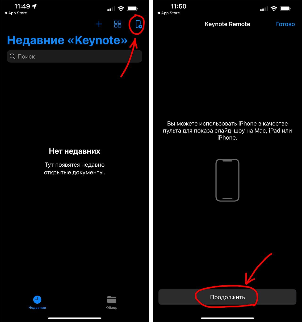 1. Запустите Keynote на iPhone, с помощью которого вы будете управлять презентацией и коснитесь кнопки пульта, затем коснитесь «Продолжить».
