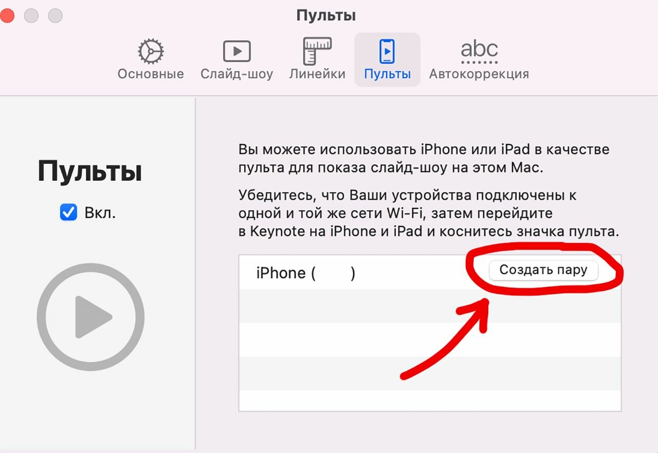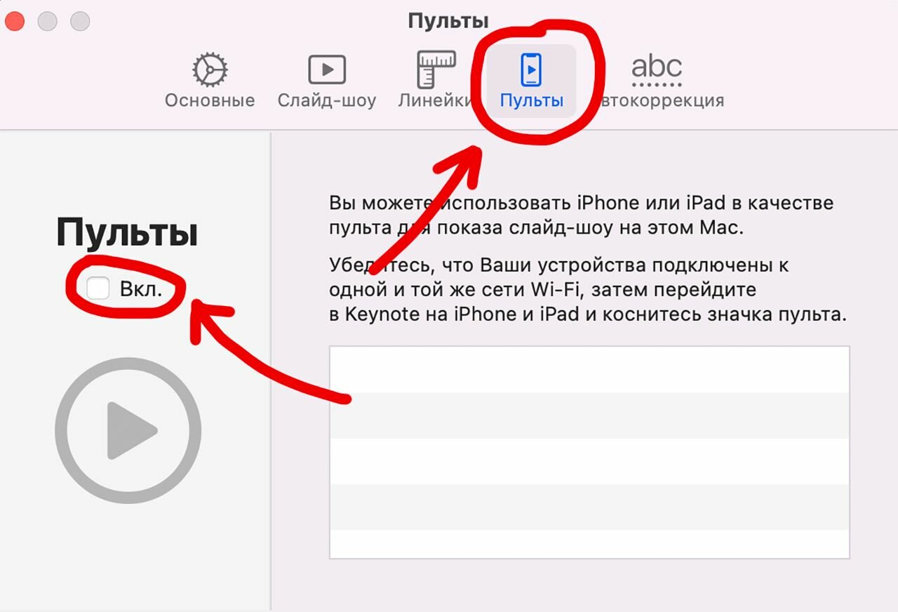 3. В строке меню выберите Keynote > «Настройки», щелкните «Пульты», затем установите флажок «Включить».