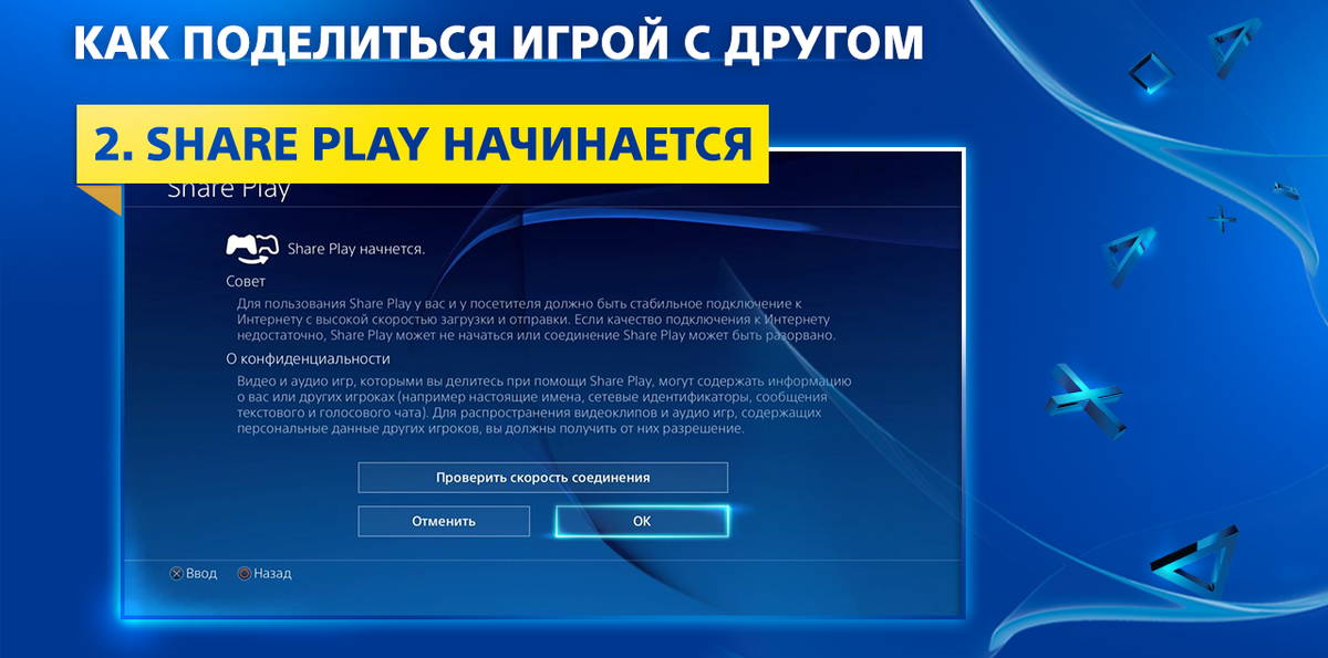 Лучше всего Share Play работает, когда и у вас, и у вашего друга высокоскоростное соединение с Интернетом. Конфигурация и загруженность домашней сети каждого игрока также влияет на качество соединения. Рекомендуется использовать подключение со скоростью не менее 2 Мб/с. Скорость загрузки в сеть можно узнать у своего поставщика интернет-услуг.