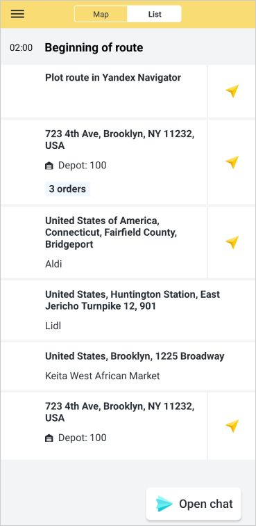 The order lists displays depots and orders in the order they must be visited in. In some cases, the route is not fully visible. See Limiting the number of visible orders for more information.