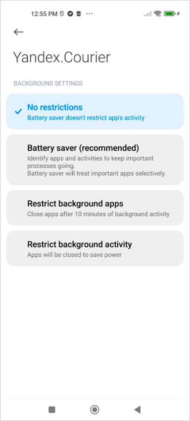 To receive route updates and important notifications, set Yandex Courier to run in the background: