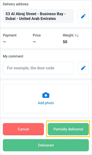 If no preset reasons apply, the courier can press Your comment and describe why the order was delivered partially.