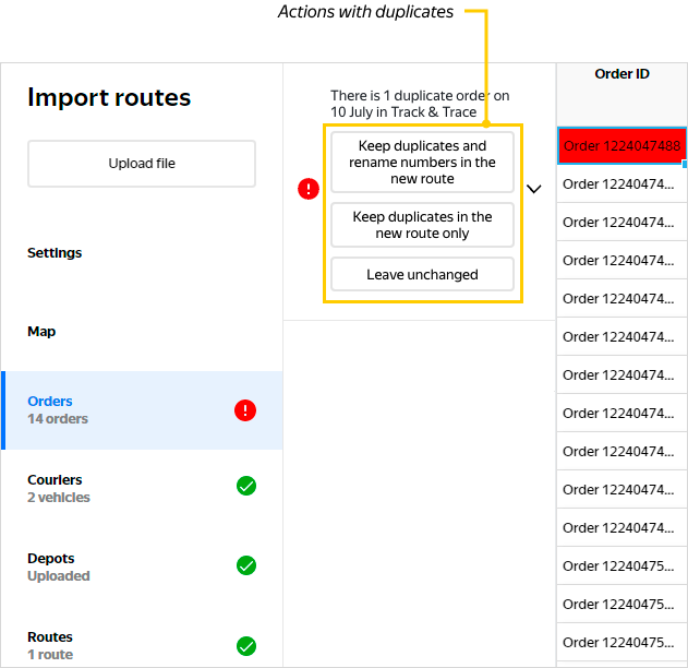 If you try to import a route immediately after selecting this option, Track & Trace returns an error saying "Couldn't send imported data". First, replace duplicate orders on the Orders tab.