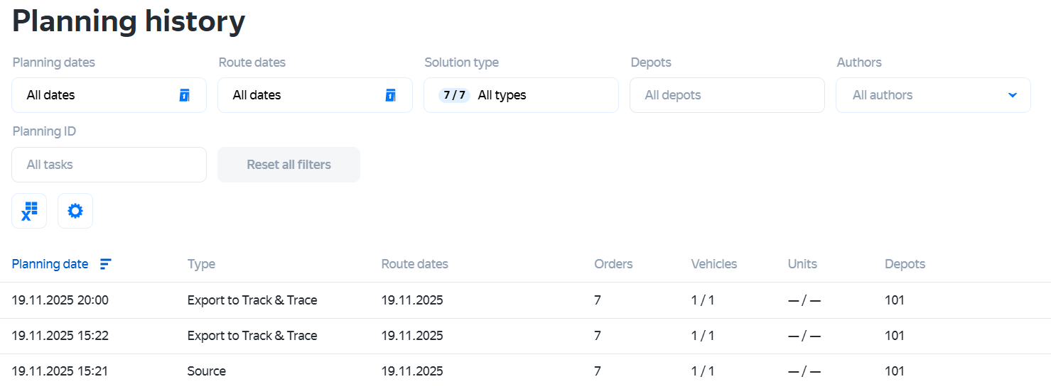 In Planning → History, you can view and edit previously created solutions. RouteQ stores solutions for the past 12 months. To learn more, see Data storage period.