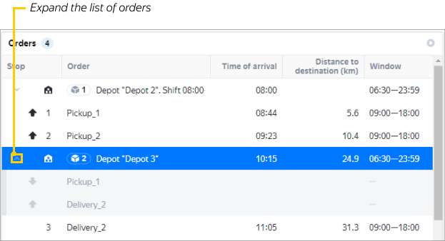 To view the list of orders that are to be picked up from or delivered to a depot, click the arrow. The number of orders is indicated on the icon next to the depot name.