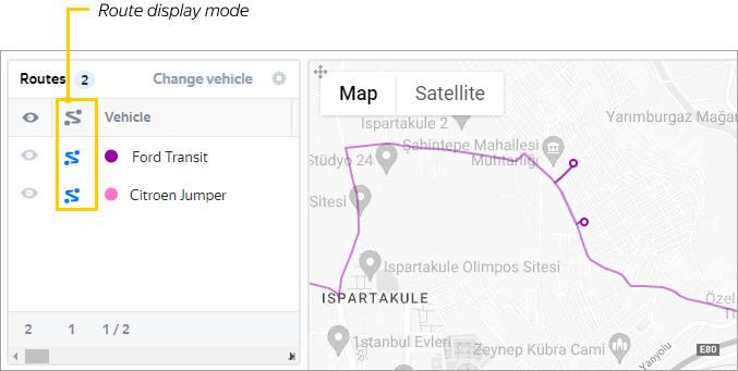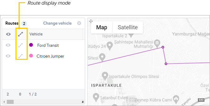 : Switch the route display mode: simple straight lines or roads. To enable this feature, contact technical support.