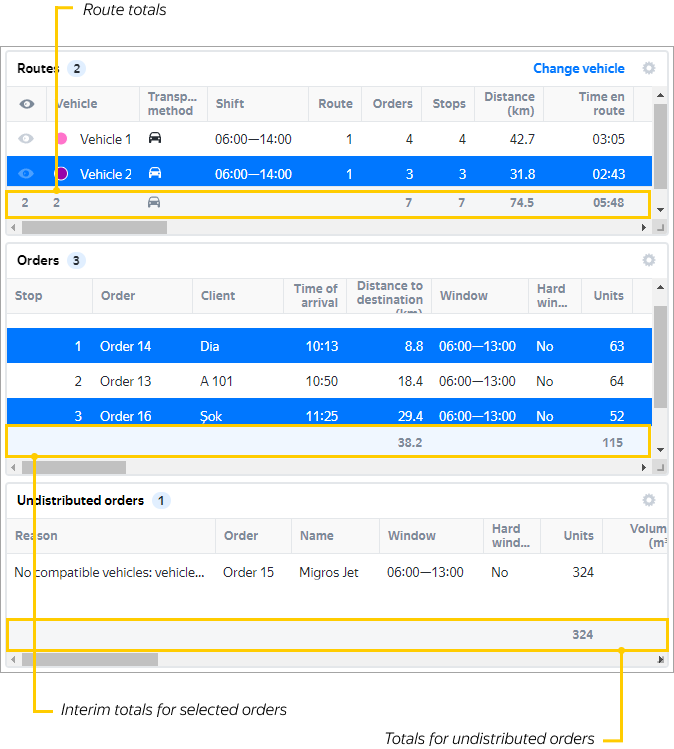 Totals for routes and orders are displayed in the tables' respective rows. For the Orders and Unassigned orders tables, you can also view interim totals for part of the orders. To do this, select the rows you need. To select multiple different rows, press and hold Ctrl. To select consecutive rows, press and hold Shift, then select the first and last row of the range you need.