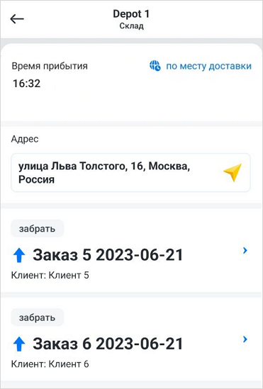 Заказы, которые нужно забрать или доставить на склад. У каждого заказа указан номер и информация о клиенте. Чтобы перейти в карточку заказа, нажмите