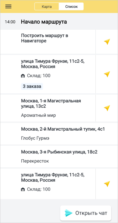 В списке склады и заказы маршрута расположены в порядке, в котором их нужно посетить. В некоторых случаях маршрут виден не полностью (подробнее см. в разделе Ограничение количества видимых заказов).