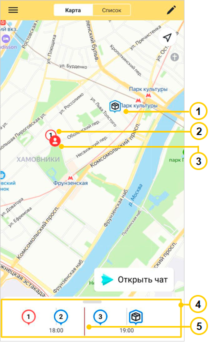 Маршрут отображается двумя способами: на карте или списком. По умолчанию в приложении выбрана карта. Переключайте вид Карта / Список в верхней части экрана.