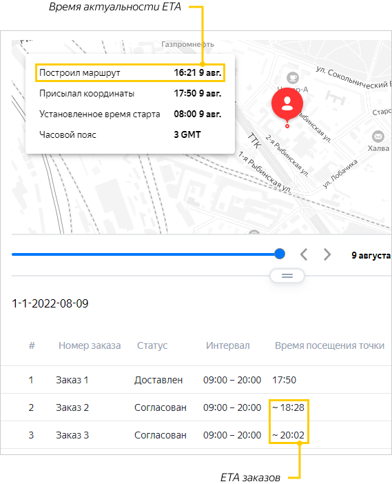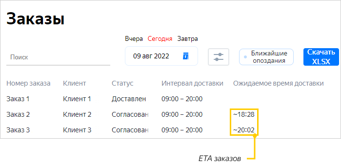 Ожидаемое время прибытия (Estimated Time of Arrival, ETA) — прогноз времени прибытия, который сервис Мониторинга рассчитывает для недоставленных и неотмененных заказов на маршруте каждые несколько минут. При составлении прогноза учитываются текущие данные о пробках и загруженности дорог.