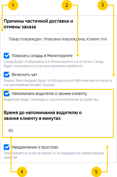 Вы можете указать причины, по которым заказ отменен или частично доставлен, чтобы курьер мог выбрать их из списка. Для этого в поле Причины частичной доставки и отмены заказа перечислите через запятую возможные варианты.