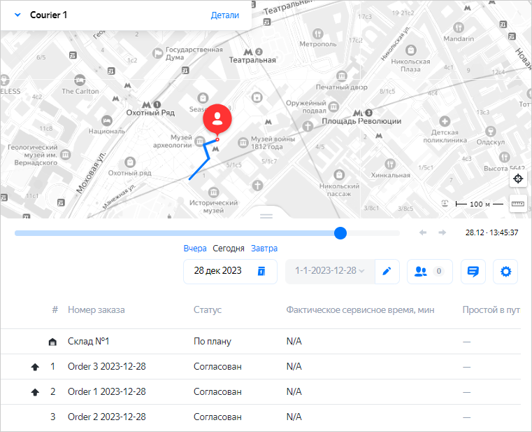 По умолчанию отображается информация за сегодняшний день. Чтобы посмотреть работу курьера за другую дату, используйте ссылки Вчера, Завтра или введите произвольную дату.