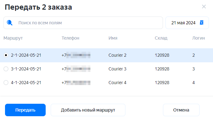 Вы можете передать весь маршрут целиком другому курьеру. Для этого нажмите → Передать маршрут курьеру. Если нужного курьера нет в списке, вы можете добавить его.