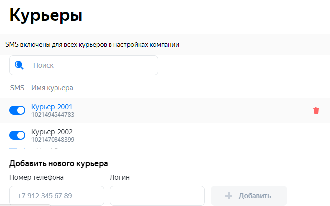 Вы можете настроить SMS-оповещение клиентов о статусе доставки для каждого курьера. Для этого установите переключатель справа от имени курьера в нужное положение.