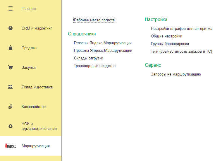 Для формирования запроса в сервис Яндекс Маршрутизация требуется ввести необходимые настройки модуля и заполнить справочники Склады отгрузки и Машины.