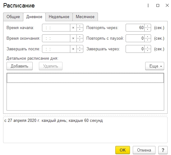 Окно настройки расписания является типовым и дает возможность гибко настроить интервалы запуска обработки в зависимости от особенностей использования сервиса.
