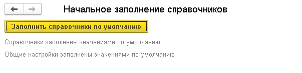 Для заполнения настроек по умолчанию воспользуйтесь автоматической обработкой Начальное заполнение справочников. Эту обработку можно открыть через меню Файл → Открыть и далее нажать на кнопку Заполнить справочники по умолчанию.