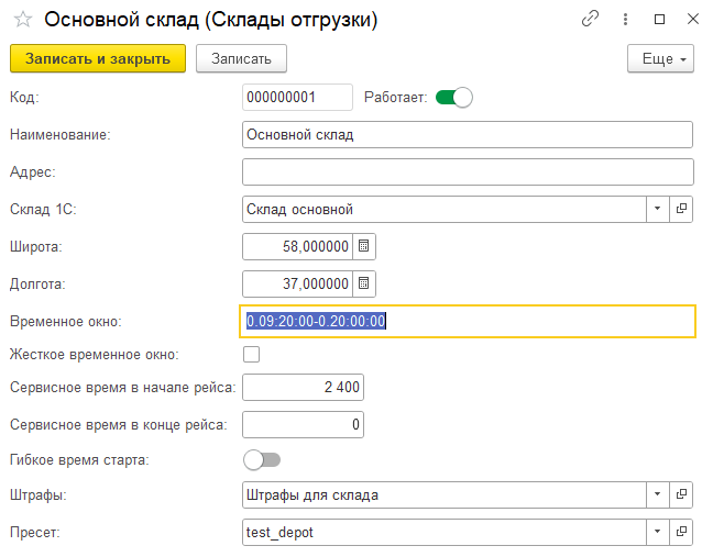 Для целей тестирования в настройках есть параметр Заполнять координаты случайными значениями. Если установить его в значение Да, то координаты будут заполняться случайными значениями в зависимости от координат склада — это позволит протестировать модуль без использования ключа геокодирования.
