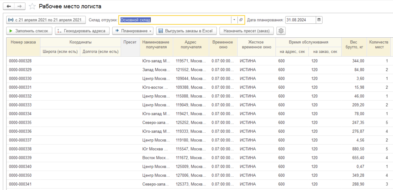 Координаты для заказов можно заполнить в списке вручную. Если нужно геокодировать адреса, нажмите кнопку Геокодировать. Для этого в настройках должен быть указан API-ключ сервиса Яндекс Геокодирование.