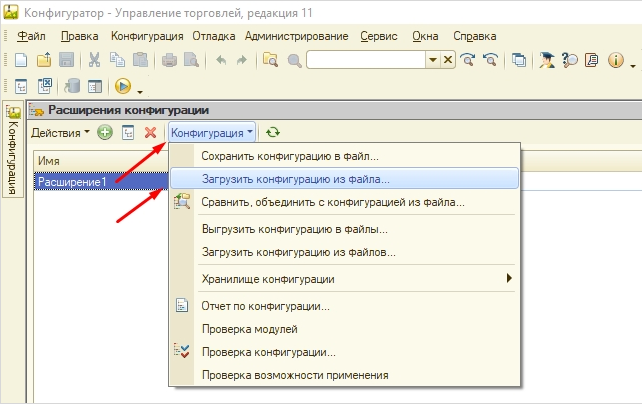 Для установки расширения нужно запустить 1С в режиме конфигуратора и открыть список расширений. Для этого нужно запустить пункт меню Конфигурация и выбрать там подпункт Расширения конфигурации.