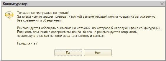 При появлении диалогового окна с информацией о загрузке конфигурации нажать ОК.