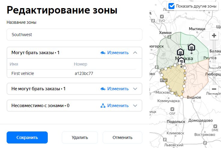 - Указать, какие автомобили могут брать заказы из этой зоны и какие не могут.