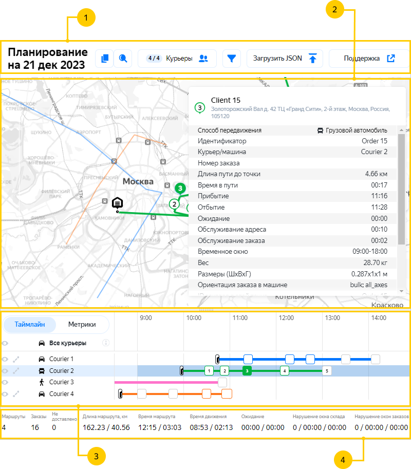 Чтобы посмотреть результат с параметрами из ответа API, нажмите . Во всплывающем окне Метрики планирования вы найдете значения основных метрик и опций решения.
