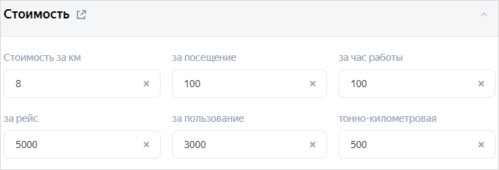 Стоимость можно указывать только в расширенном режиме. Вы можете указать стоимость за километр, за посещение, за час работы, за рейс, за пользование и за тонно-километр транспортной работы.