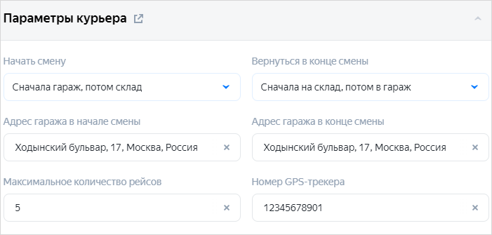 В расширенном режиме для курьера можно также ограничить максимальное количество рейсов и указать, где начать и где закончить смену.