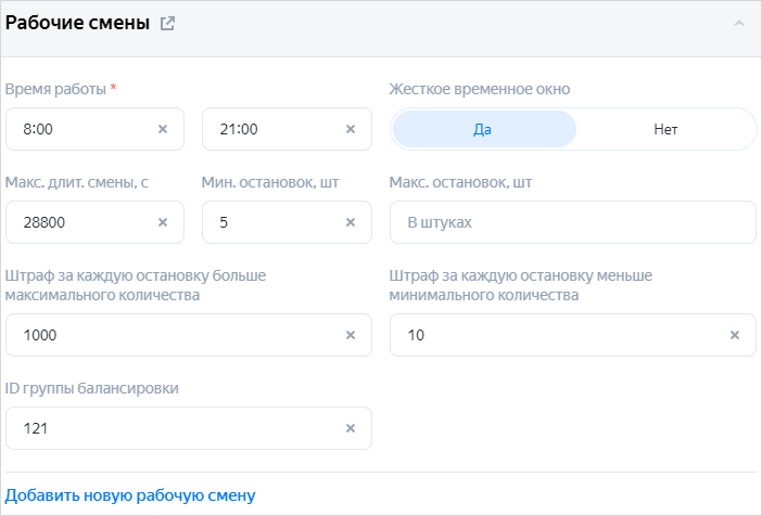 Для транспортного средства нужно определить хотя бы одну рабочую смену — диапазон времени, в который разрешена его работа. Время смены включает в себя время нахождения на складе при загрузке, а также время в движении и сервисное время на заказах. Рабочих смен может быть несколько.