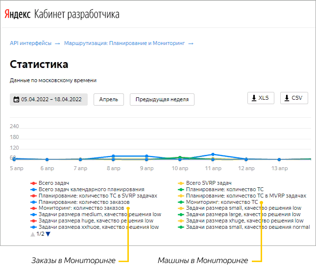 Результаты можно видеть в счетчиках «Планирование: количество ТС» и «Планирование: количество заказов» в Кабинете разработчика в разделе «Статистика».