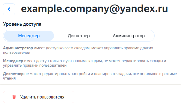 Если вы назначаете роль Менеджер или Диспетчер, укажите, к каким складам и компаниям предоставить доступ пользователю.