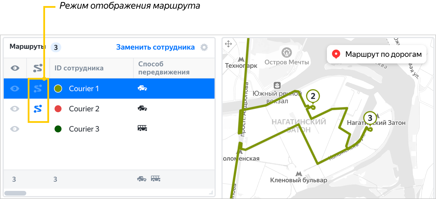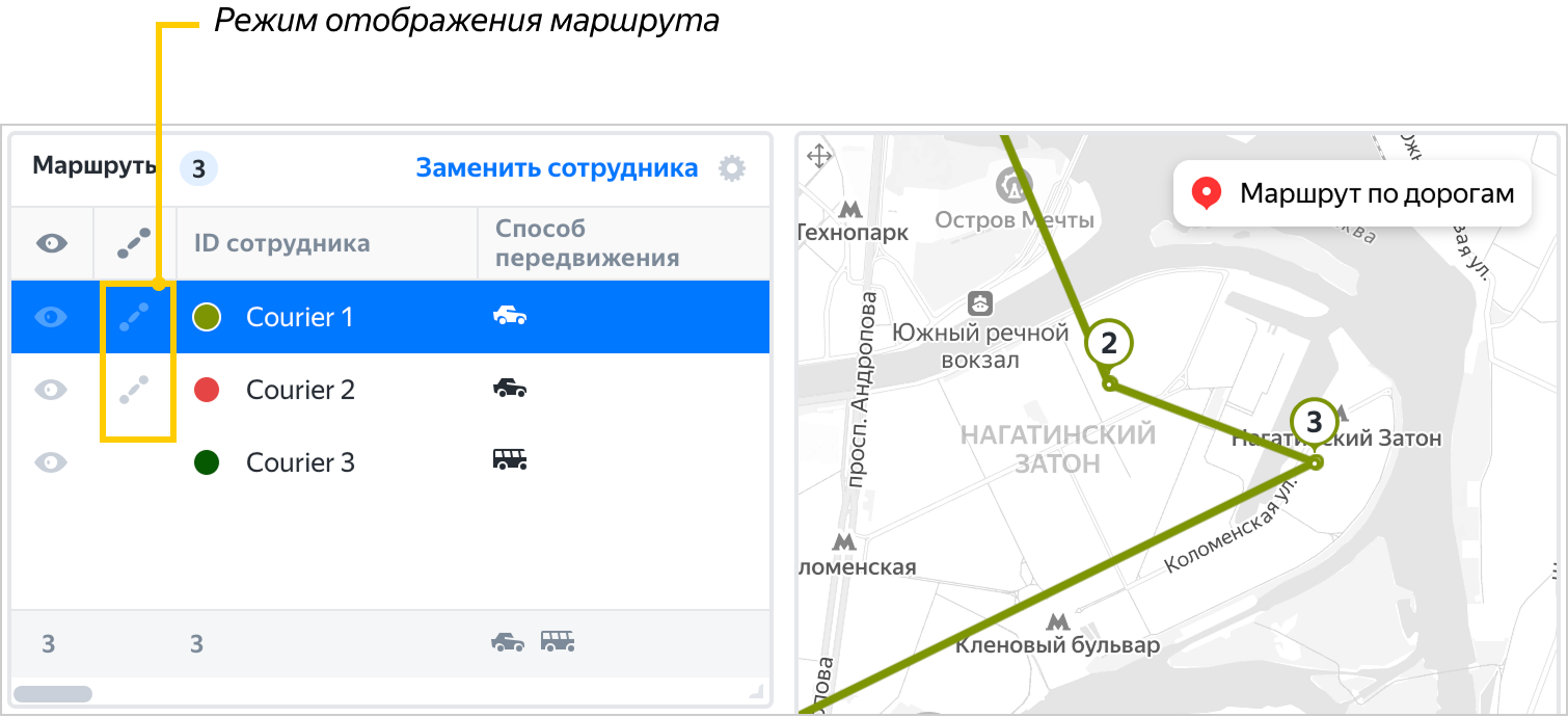— значок переключает отображение маршрута: схематично прямыми линиями или по дорогам. Чтобы подключить эту возможность, обратитесь в техподдержку.