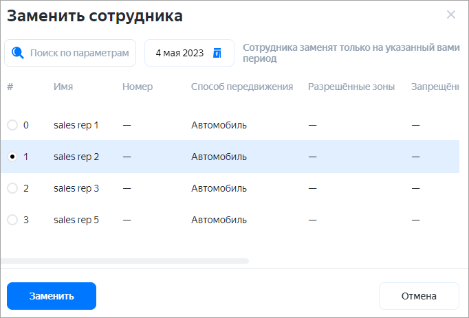 Выделите сотрудника в таблице Маршруты и нажмите Заменить сотрудника. В открывшемся окне выберите необходимого сотрудника. Если нужно заменить сотрудника только на определенные даты, укажите период замены. По умолчанию указывается весь период выбранного маршрута.