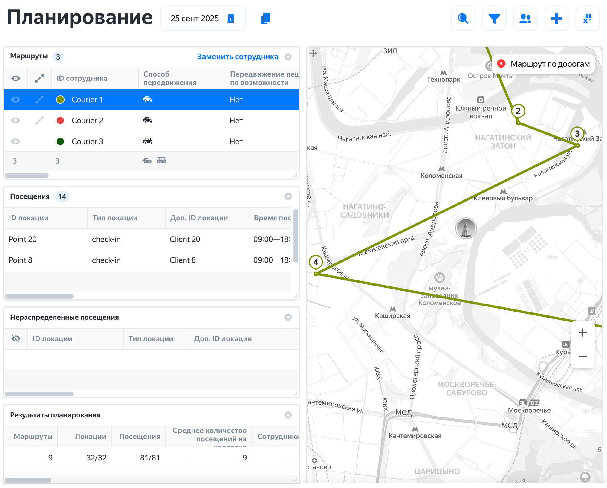 Чем больше значение метрик Утилизация времени посещенийaffecting_utilization и Утилизация всего рабочего времениgeneral_utilization, тем маршруты оптимальнее.