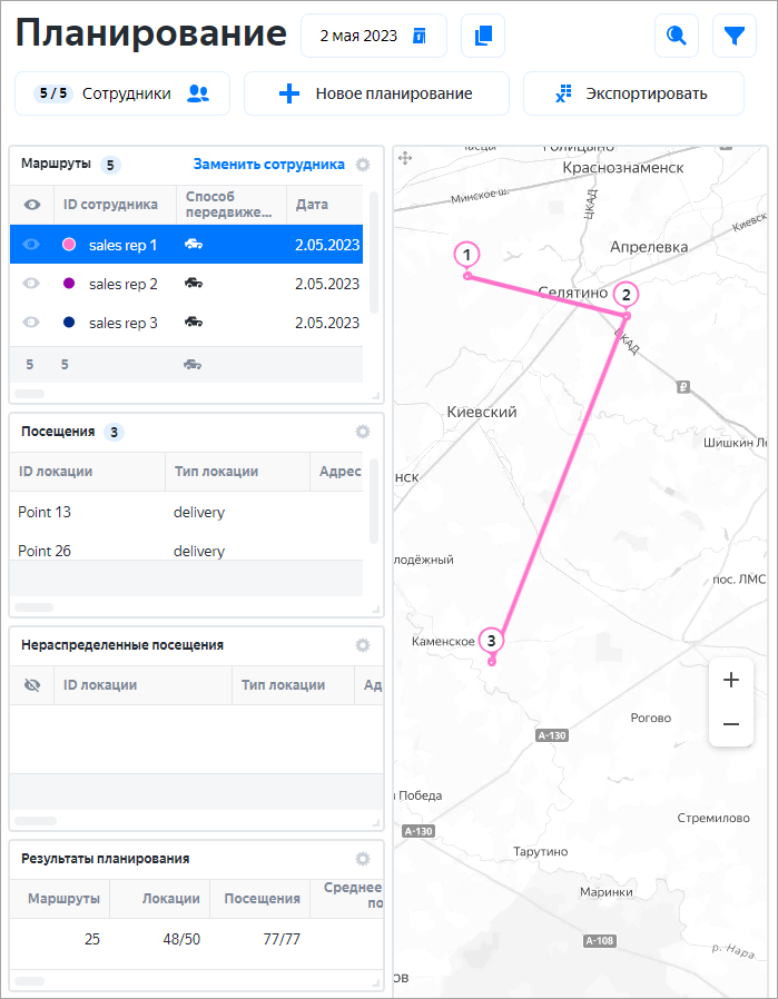 При выборе маршрута на карте он будет выделен в таблице, и наоборот — при выборе маршрута в таблице он будет выделен на карте. Аналогично при выборе точки маршрута на карте в таблицах будет выделено соответствующее посещение локации, а при выборе посещения в таблице соответствующая точка маршрута будет выделена на карте.