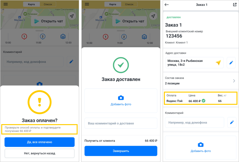 Нажмите Завершить. Статус заказа в приложении изменится на Доставлен.