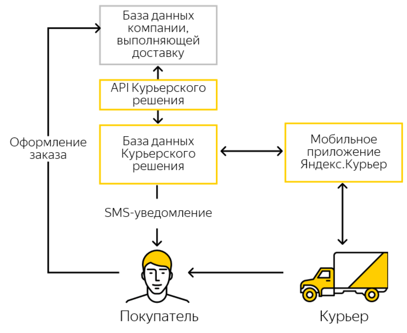 - Передает информацию о маршруте на терминал курьера с установленным приложением Яндекс Курьер.